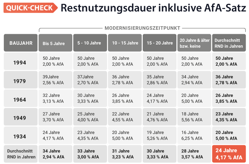 Durch ein Nutzungsgutachten eines qualifizierten anerkannte Gutachters können Sie Ihre Immobilie gegebenenfalls nicht nur mit 2% (über 50 Jahre), sondern entsprechend der begutachteten Restnutzungsdauer, bswp. mit 4% (über 25 Jahre) abschreiben.
